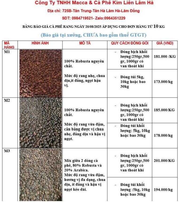 Dù bạn là người yêu cà phê, chủ quán, người rang thủ công hay đại lý phân phối, việc theo dõi sát giá cà phê rang xay giúp bạn ra quyết định kịp thời, tiết kiệm và hiệu quả hơn. Và nếu bạn đang tìm nguồn cà phê nguyên chất, giá cả minh bạch, chất lượng ổn định — đừng bỏ lỡ cơ hội kết nối với Kim Liên Lâm Hà. Theo dõi fanpage Kim Liên Lâm Hà để được cập nhật giá cà phê rang xay mỗi ngày, cùng với các sản phẩm nông sản chất lượng như hạt macca, hạt điều, cà phê nhân và nhiều hơn thế nữa. Tại đây, bạn không chỉ tìm thấy mức giá tốt mà còn nhận được tư vấn tận tâm, đúng gu, đúng nhu cầu. Theo dõi và liên hệ tư vấn miễn phí bạn nhé!